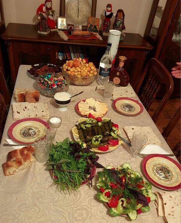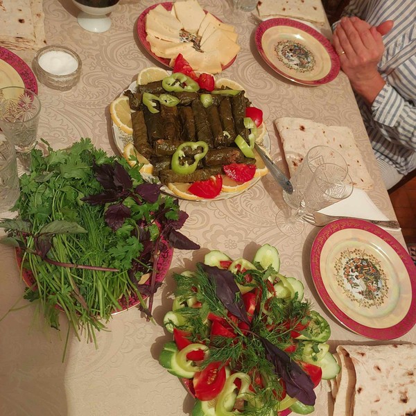 Готовим и пробуем. Вы сможете участвовать во всех этапах готовки либо быть наблюдателем — в любом случае с собой вы заберёте мой секретный рецепт толмы. Когда мы сформируем трубочки и отправим их в кастрюлю, я достану заранее приготовленную готовую толму — это позволит нам сэкономить время и сразу приступить к самому важному этапу — ужину! :) А к главному блюду я подам лаваш, мацони, свежие овощи и армянское вино.