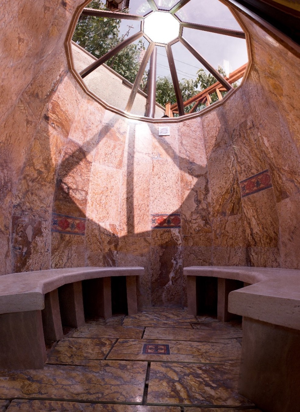 Армянская баня. Она построена из местного травертина — камня, который славится своими лечебными свойствами. Горячий влажный пар армянской бани помогает тренировать кожу, постепенно улучшая функции сальных желез. В результате повышается упругость кожи и исчезают мелкие морщинки. Также баня способствует очищению и оздоровлению дыхательных путей, укреплению иммунитета, выведению токсичных веществ из организма, снижению веса.