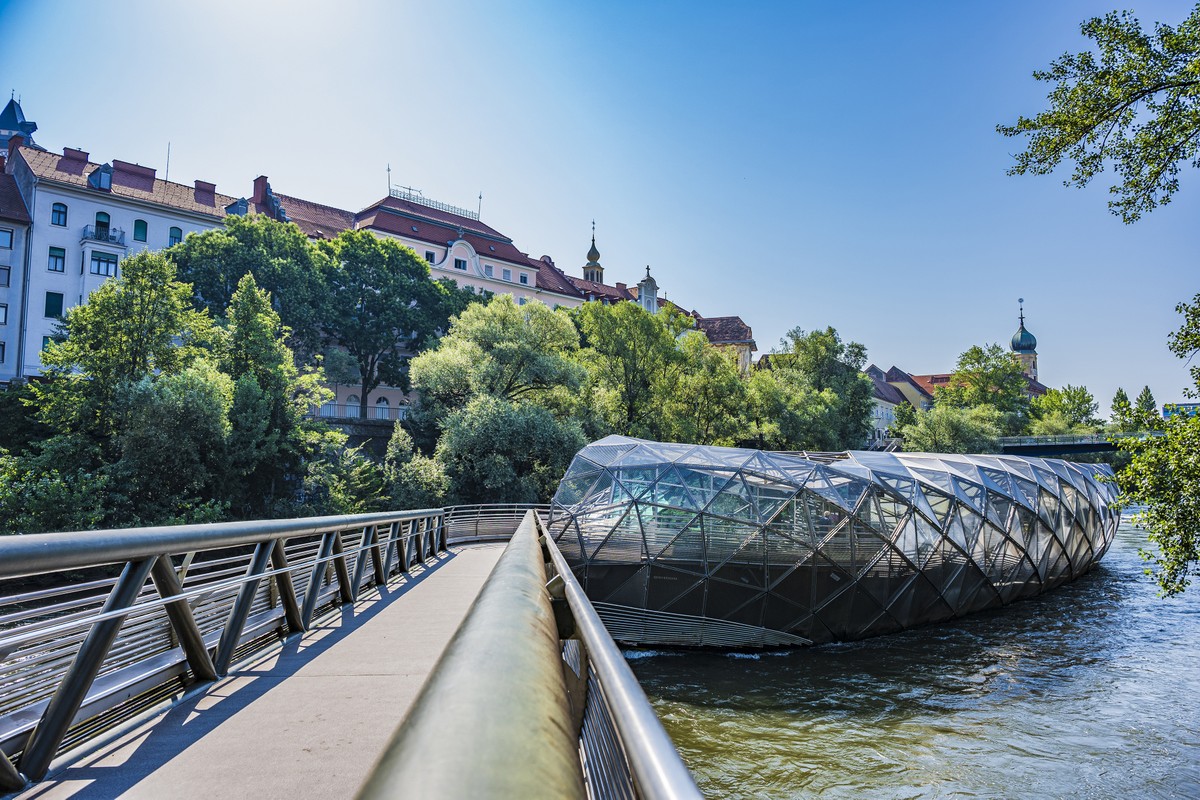 Неожиданно для себя вы откроете и другое лицо города с авангардной архитектурой. Я раскрою, благодаря какому мировому проекту Грац стал архитектурно прогрессивным местом с неординарными сооружениями — вы увидите здание-облако Кунстхаус, а также искусственный остров-ракушку на водной глади реки Мур Муринзель. В завершение мы поднимемся на гору Шлоссберг, откуда вам откроется захватывающий вид на многоликий Грац.