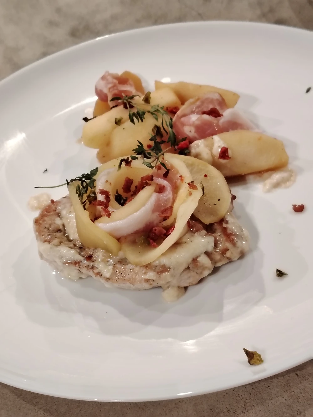 - Стейк по-радзивилловски из свинины со сливочным соусом, пряными яблоками и копчёной грудинкой — рецепт известен с 16 века