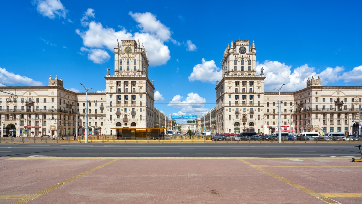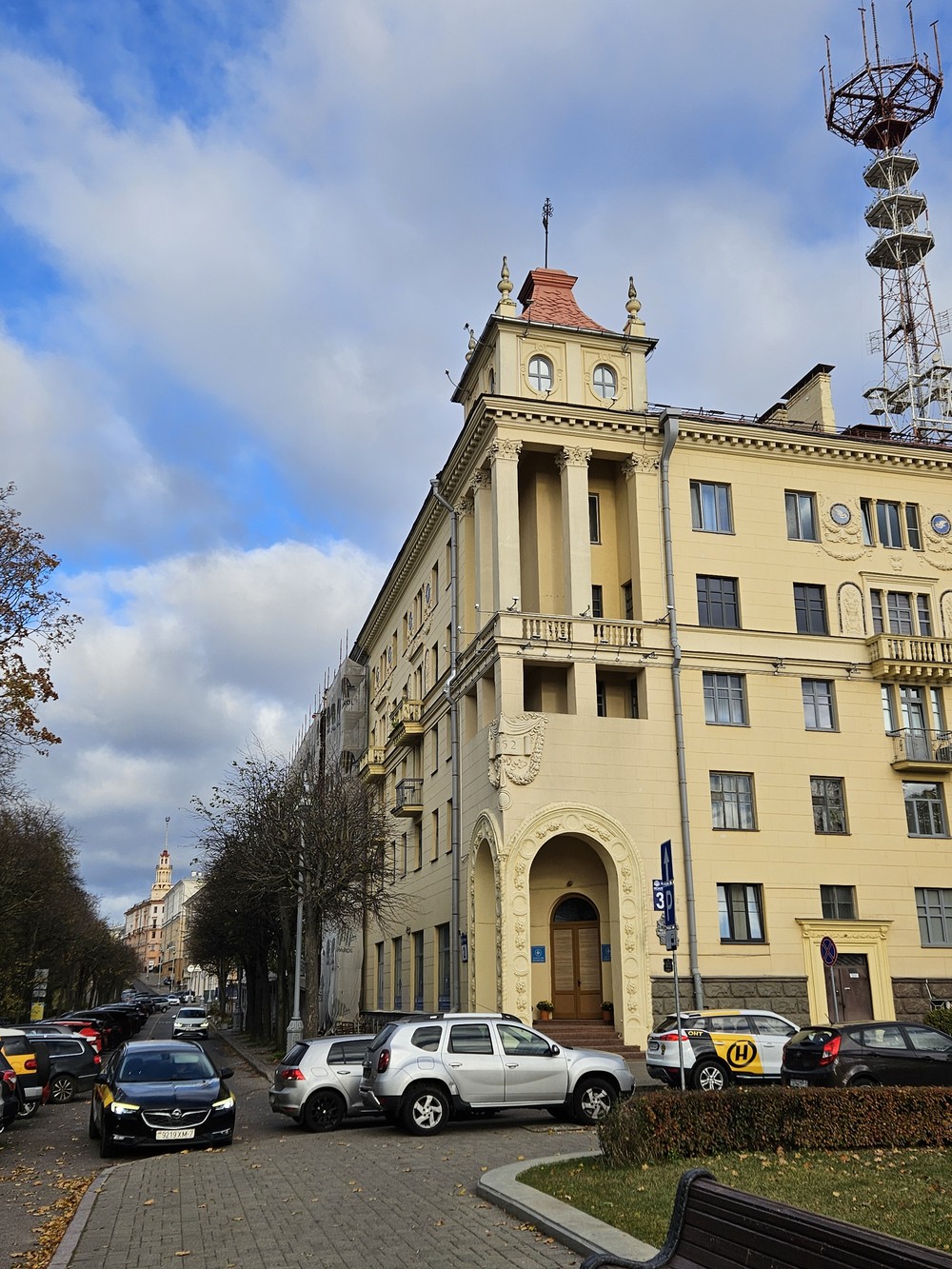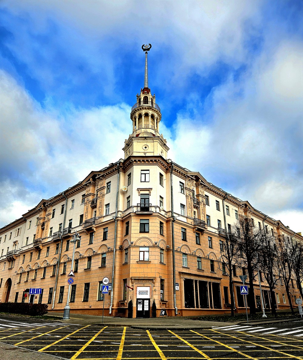 - Рассмотрите дом под шпилем и здание Белтелерадиокомпании