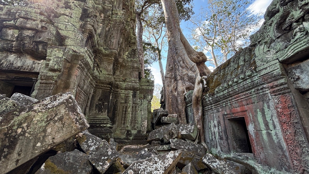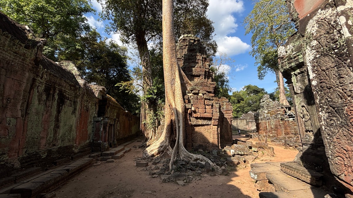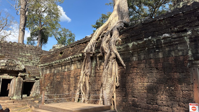 Та Пром — один из самых живописных храмов Ангкора, который сегодня можно увидеть практически в первозданном виде. Гигантские корни деревьев оплетают его стены.