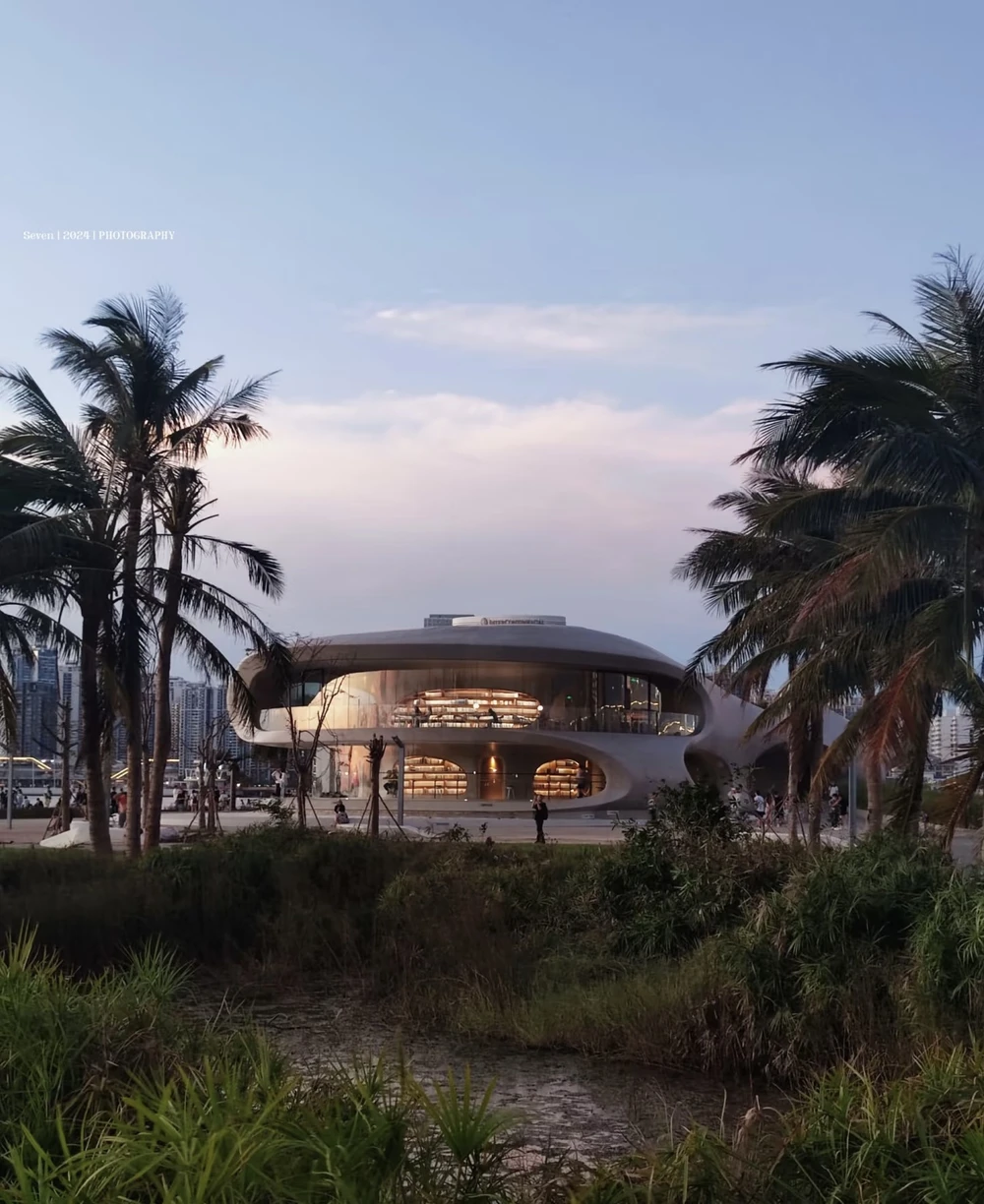 Прибрежная библиотека с футуристической архитектурой и панорамным видом на море — месте для созерцания.