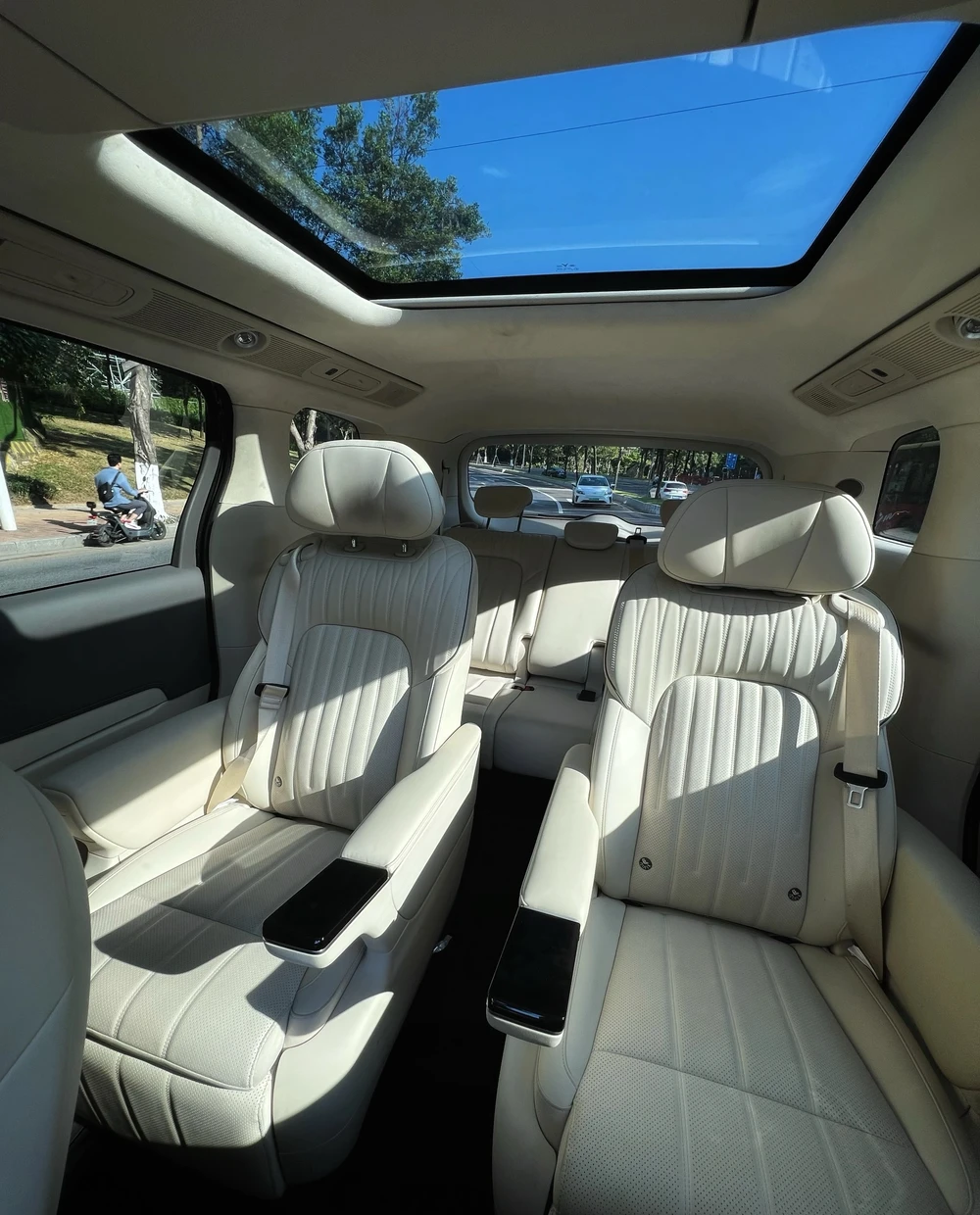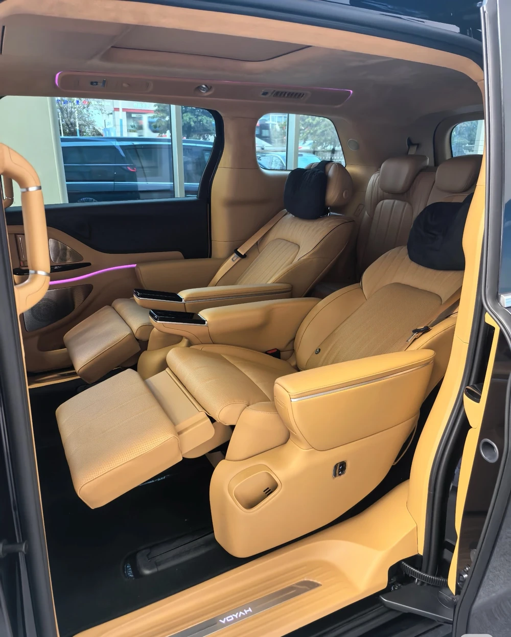 - Voyah Dreamer: воплощение технологичной роскоши. Салон оснащён выдвижными оттоманками для ног, встроенным холодильником и системой ароматизации воздуха. Для работы и развлечений предусмотрен огромный блок дисплеев во всю ширину салона