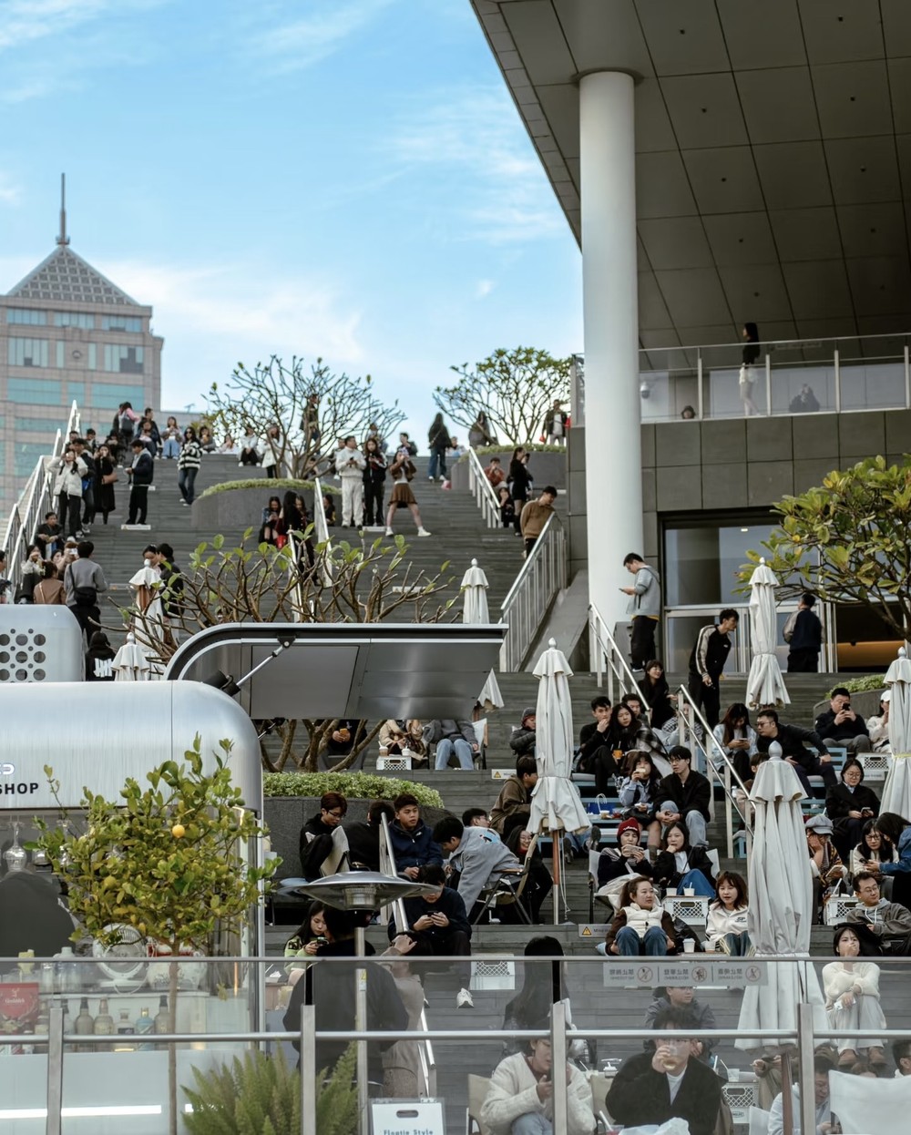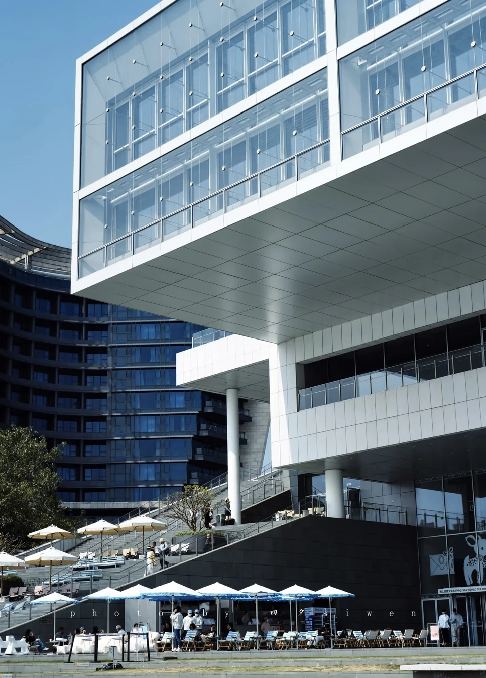 Минималистичный культурный центр и прибрежное пространство отлично подходят для неспешной прогулки и отдыха у воды. Вечером район особенно выразителен благодаря отражению огней.