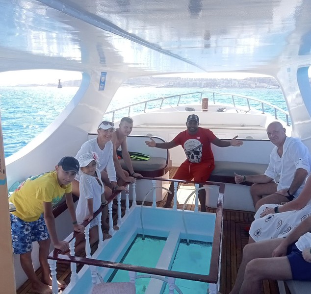 " Красное море известно кристально чистой водой, красочными коралловыми рифами и экзотическими рыбками всех цветов радуги. Прогулка на лодке с прозрачным дном позволит вам увидеть всё это своими глазами. Вы отдохнете, позагораете, искупаетесь, поплаваете с маской. Проведете время весело и беззаботно! "