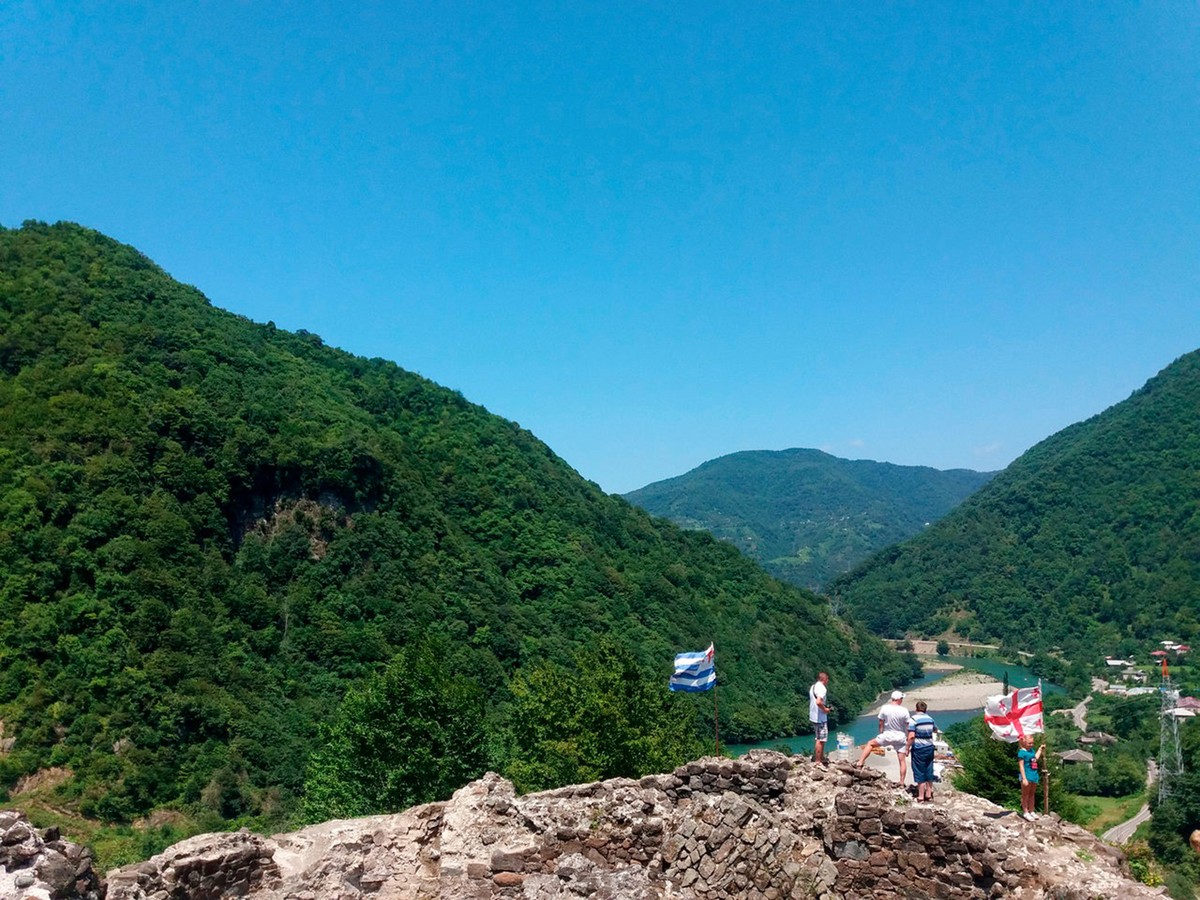 Крепость Гвара. Если будет сухо — спустимся к стенам. Узнаем, как устроена крепость, для чего зарывали в землю кувшины и почему здесь реют флаги Аджарии и Грузии. В дождь и снег к крепости не спускаемся — это небезопасно.