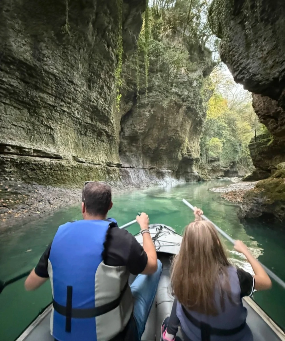 Изумрудная вода, отвесные скалы и прогулка на лодке — идеальное завершение дня. Один из самых красивых каньонов Грузии.