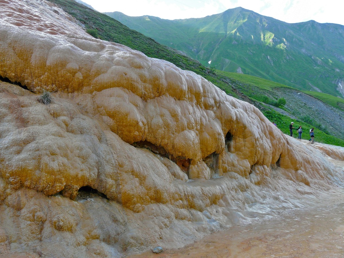 - Миновав Крестовый перевал, остановимся у необыкновенной травертиновой скалы: по ее оранжевым склонам текут минеральные воды, а рядом есть источник, где вы попробуете природный солоноватый нарзан.