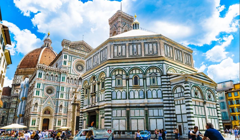 Соприкосновение с госпожой Историей начнется на площади Святого Иоанна, где особое внимание привлекает грациозный Баптистерий Сан-Джованни. Мы обсудим его экстерьер, осмотрим позолоченные двери с множеством барельефов, северные и восточные ворота с панелями, представляющими библейские сюжеты. Позади крещальни расположился величественный кафедральный собор Санта-Мария-дель-Фьоре — известнейшее творение периода Раннего Возрождения. Я расскажу о строительстве церкви и о том, какая трагическая история связывает ее с семейством Медичи.
