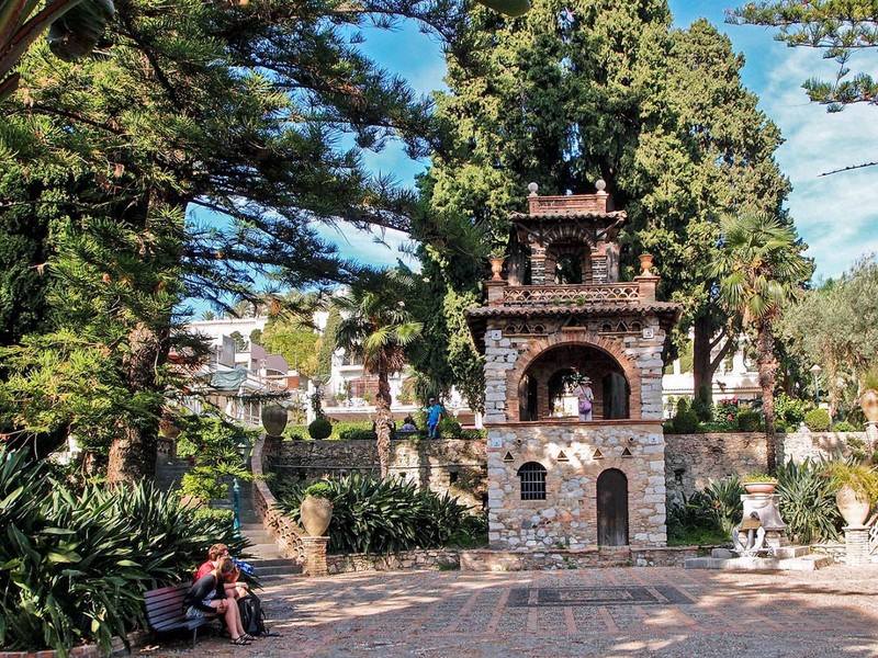 От жаркого солнца спрячемся в тень городского парка. Вы услышите о его основательнице — англичанке Флоренс Тревельян. Её стараниями у таорминцев появилась возможность наслаждаться экзотическими растениями и деревьями, каменными лестницами, статуями и причудливыми беседками.