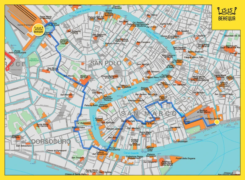 Что такое скуола? Разберёмся и посмотрим на одну из них — Сан-Рокко. Не пропустим церковь Санта-Мария-Глориоза-деи-Фрари и лестницу Контарини дель Боволо. Будем много говорить о Венеции как городе искусства: пройдём мимо художественной галереи Академии, театра Ла Фениче и музея Коррер. А в финале пройдём по площади Сан-Марко к Дворцу Дожей.