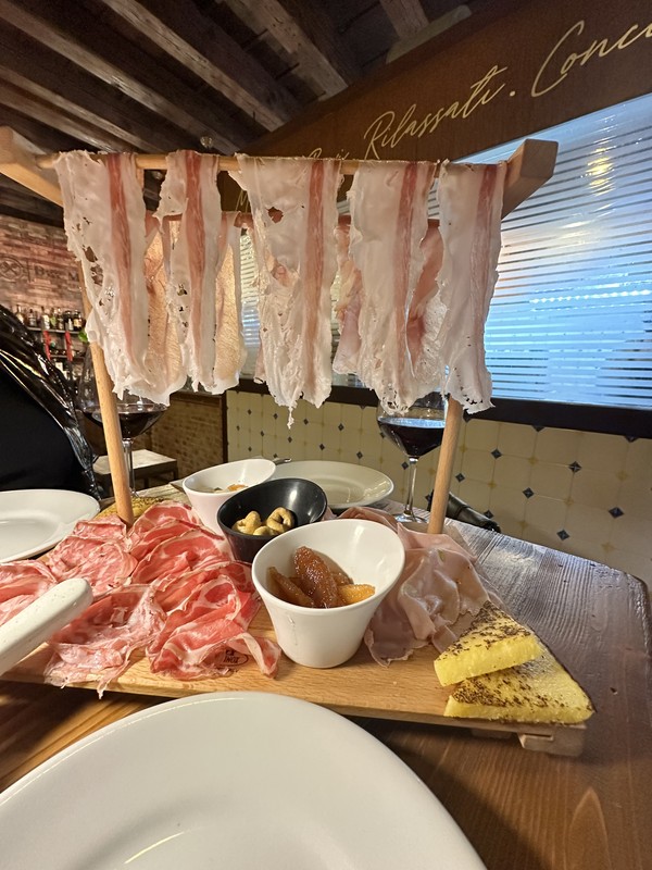 - Колбасная нарезка: сало из Колонната, мортаделла, традиционные веронские колбасы, пармская ветчина выдержки 24 месяца