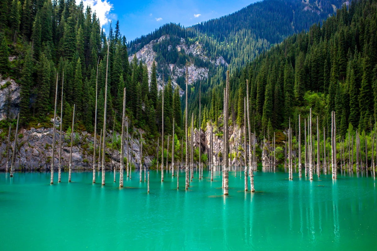 12:00 — переезд на уазиках к озеру Каинды. Это одно из самых необычных озёр Казахстана. После сильного землетрясения часть елового леса ушла под воду, и теперь из зеркальной глади поднимаются стволы деревьев. Вы узнаете легенды этого места и насладитесь завораживающими видами