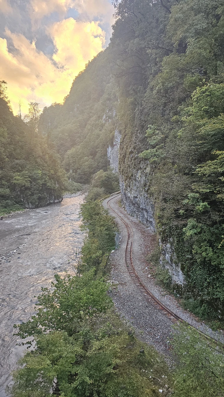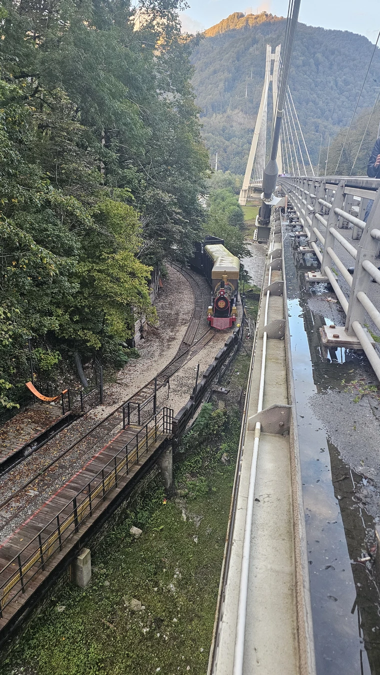 13:30–13:50 — мост Любви. Пройдёте по подвесному пешеходному мосту над бурлящей горной рекой Мзымта