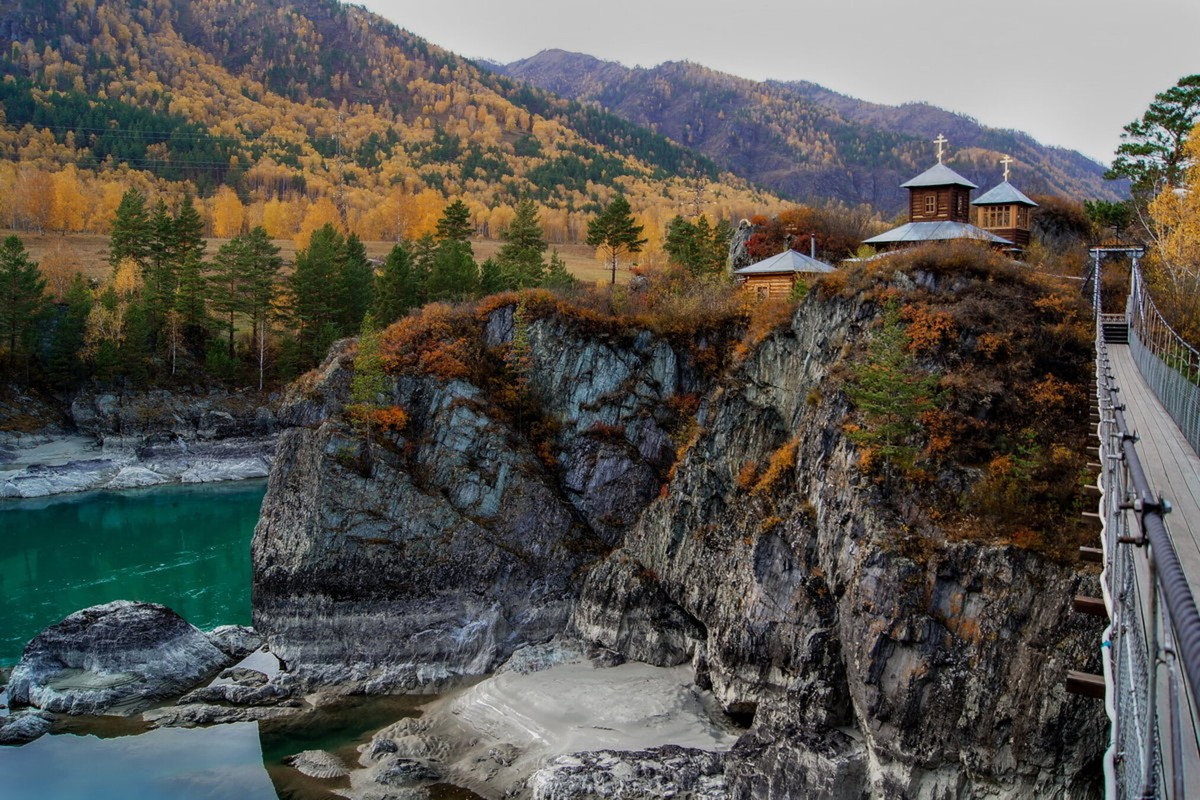 Священное место с удивительной энергетикой. Чтобы попасть на него, нужно преодолеть шаткий подвесной мост над бурной Катунью. Здесь вас ждёт храм Иоанна Богослова и высеченный в скале образ Богородицы.