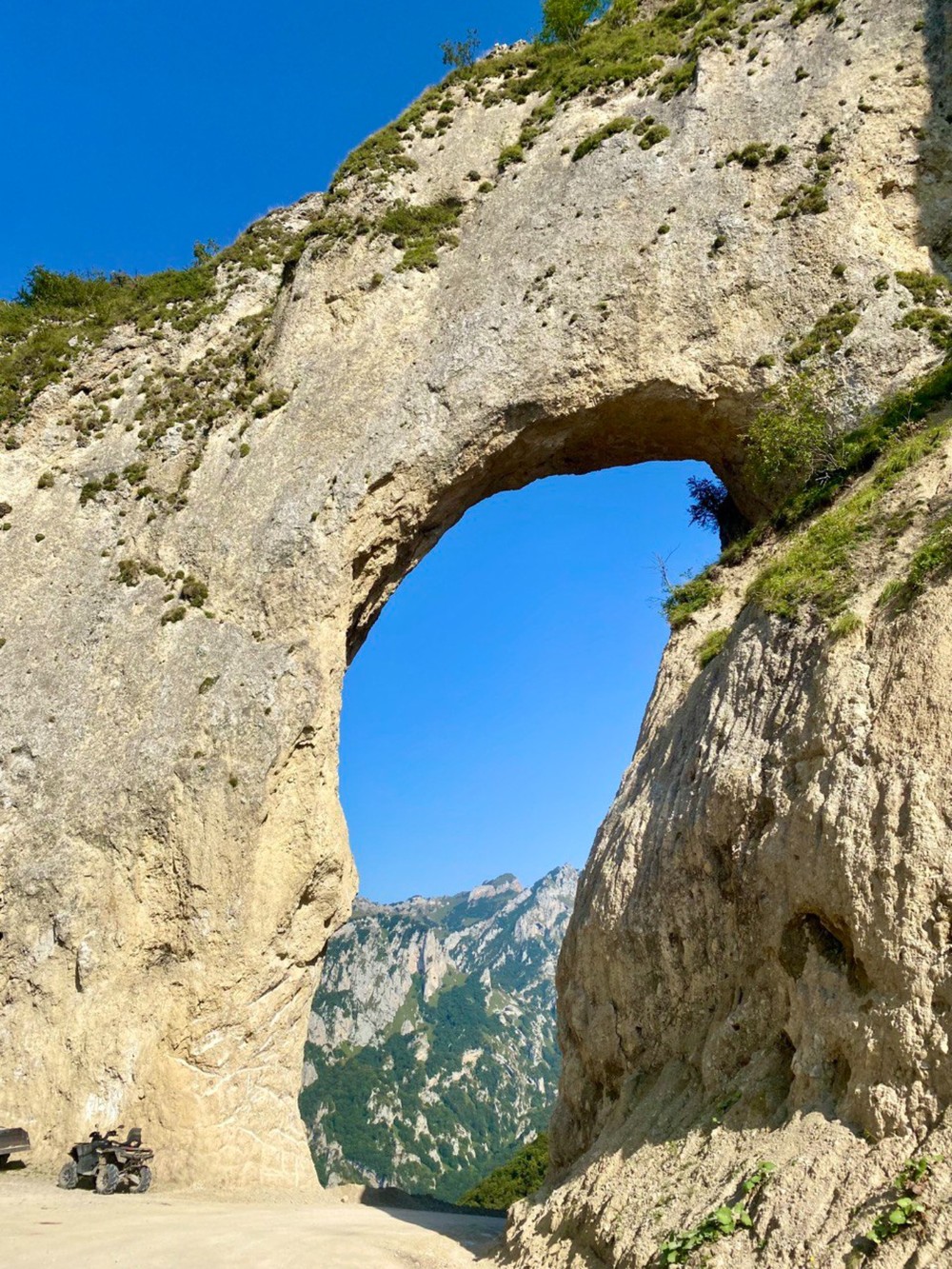 Вы увидите каменную арку естественного происхождения — редкий природный объект, словно открывающий дорогу дальше в горы.