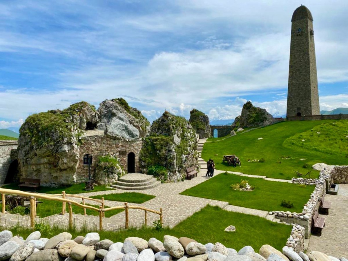 Монументальные башни и открытые горные панорамы создают ощущение пространства и высоты. В ясную погоду отсюда можно увидеть Теблусмту (Тулой Лам) — самую высокую гору Чеченской Республики.