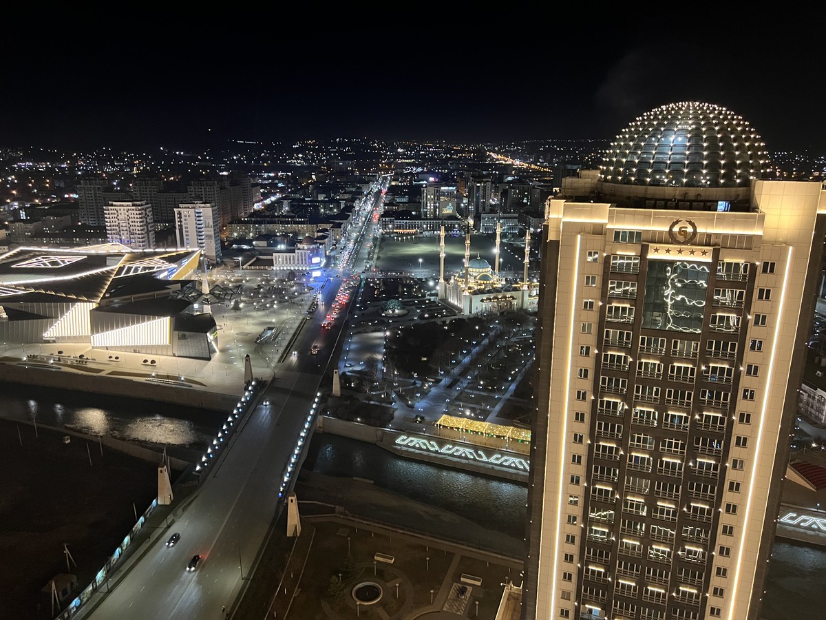 Следующая остановка — мечеть «Сердце Чечни». Мы войдём внутрь, полюбуемся убранством и поговорим о том, как строился этот грандиозный храм. После этого поднимемся на смотровую площадку комплекса «Грозный-Сити» на высоте 32 этажа. Сверху город предстанет во всей полноте — от старых районов до современных кварталов.