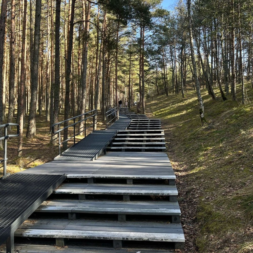 Высота Эфа (40 мин) — самая высокая дюна Куршской косы (до 50 м). Вы подниметесь по песчаному склону и словно попадёте в миниатюрную пустыню. С вершины открывается вид на Балтийское море и бескрайние леса.