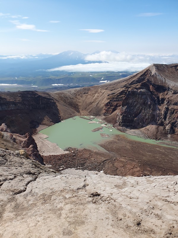 Затем мы переедем в кальдеру древнего вулкана Пра-Горелый, где находится парковка и начало пешего маршрута на вершину вулкана. А наверху вас ждут удивительной красоты кратеры! Самый привлекательный — это кратер Голубое озеро, цвет которого меняется в зависимости от времени года и активности вулкана. Да-да, вулкан Горелый — активный!