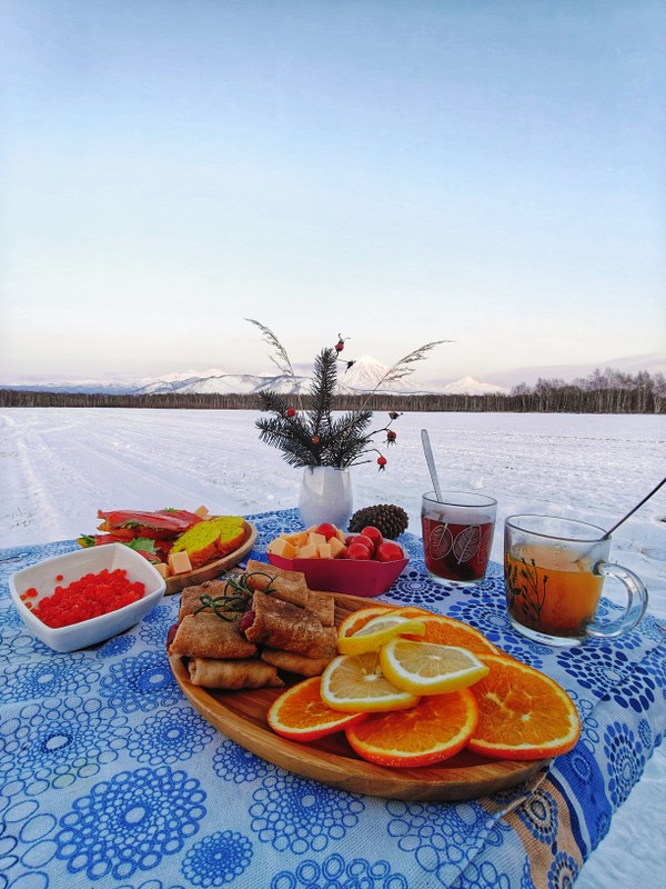 Наш путь пройдёт по живописному руслу Сухой речки. Мы доедем до подножья экструзии Верблюд, погуляем по склону вулкана, насладимся видами. И устроим пикник в камчатском стиле: бутерброды с красной рыбой, овощи, травяной чай из камчатских дикоросов — вам понравится!