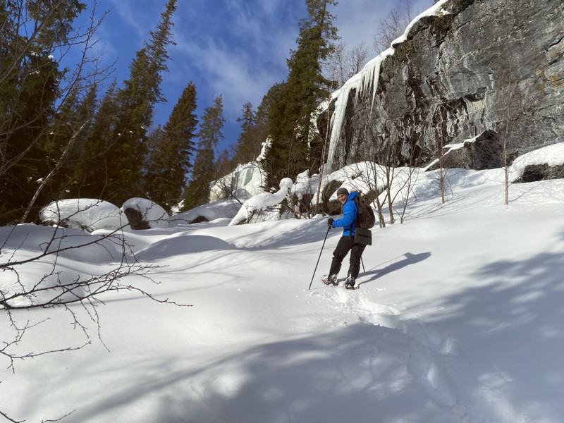 " Если вы ищете не просто прогулку, а настоящее зимнее приключение — эта экскурсия на снегоступах для вас! Мы отправимся в ущелье, где вас ждут ледяные формы, покрывающие склон хрустальным панцирем, и скала с нерукотворным профилем самой Старухи-Акки. А ещё — безмолвие заснеженного леса и древние саамские легенды. "
