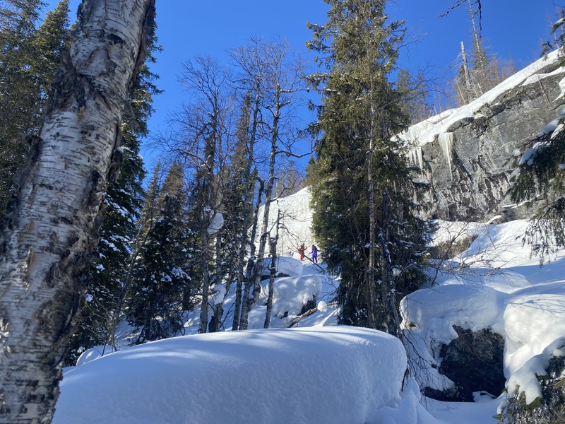 Ущелье расположено в 20 км от Кандалакши. Мы доедем до точки старта на автомобиле. Оставив машину на парковке, переоденемся в снегоступы и отправимся в путь. Нас ждёт переход по зимнему лесу протяжённостью 4,5 км в одну сторону.