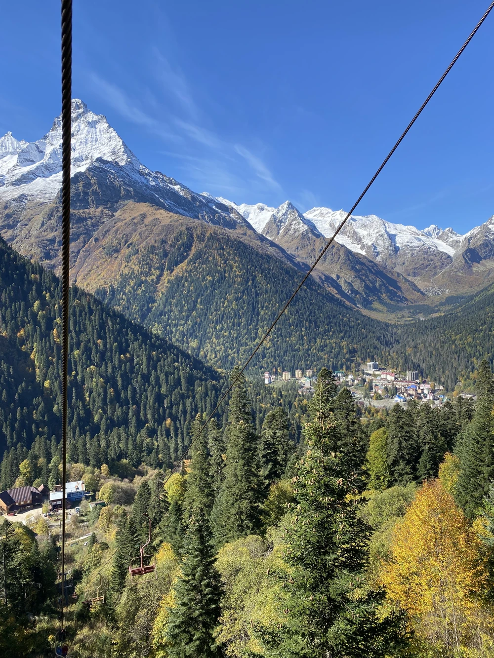 В самом Домбае у вас будет 4 часа — этого времени хватит, чтобы полюбоваться открыточными видами с вантового моста в посёлке и, конечно, подняться в горы. По желанию вы взлетите на высоту 3200 м по канатной дороге (3 очереди: 8-местный закрытый вагончик, 6 и 4-местные кресельные подъемники открытого типа). Здесь, на горе Мусса-Ачитара, вам откроются завораживающие виды на 360 градусов: амфитеатр Главного Кавказского хребта и даже Эльбрус в ясную погоду.