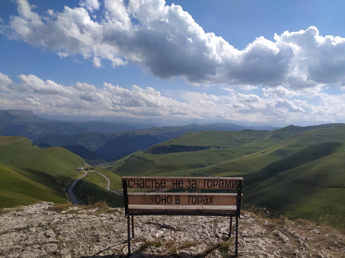- Плато Шаджатмаз — известная смотровая площадка, откуда тоже виден Эльбрус. На плато есть скамейка, которая пользуется большой популярностью у путешественников. Ещё бы — там получаются невероятно живописные кадры!