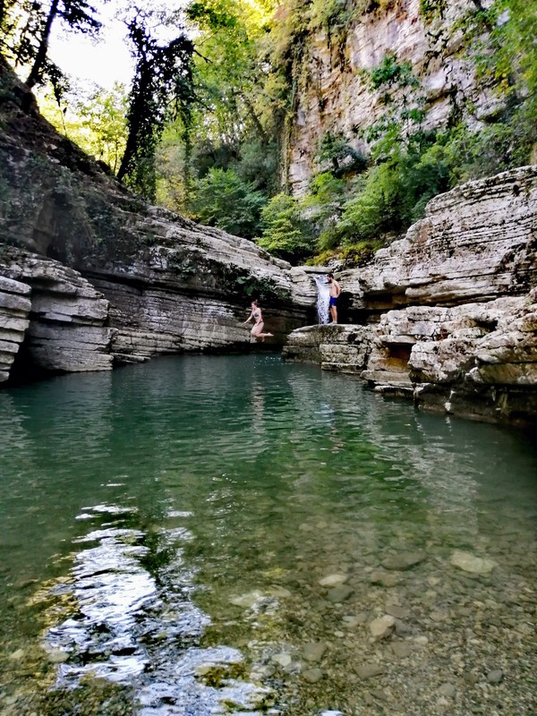 Мы прогуляемся по интересному нетуристическому маршруту, проложенному по руслу реки Псахо. Летом каньон не такой полноводный, как в другие времена года, поэтому идти можно прямо по руслу — но лучше это делать в коралловых тапочках или сандалиях.