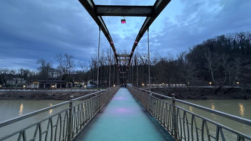 - Подвесной мост с панорамой реки Псекупс и гор, а рядом — Минеральная поляна с имперским обелиском