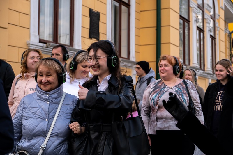 " Надев наушники, вы отправитесь по центральным улицам Красноярска. Поприветствуете писателя Виктора Астафьева, обсудите селекцию яблонь с сибирским садоводом Всеволодом Крутовским и узнаете историю любви командора Николая Резанова. Вашим спутником станет невидимый проводник, чей голос вы будете слышать в наушниках. А город развернёт перед вами бескрайнее полотно истории и оживёт на ваших глазах. "