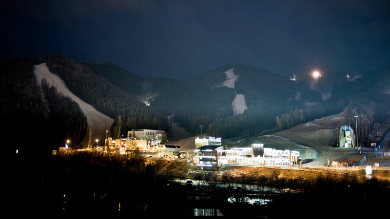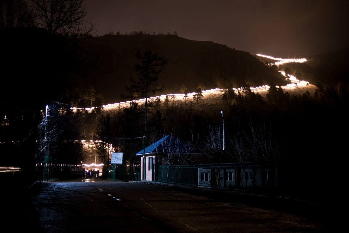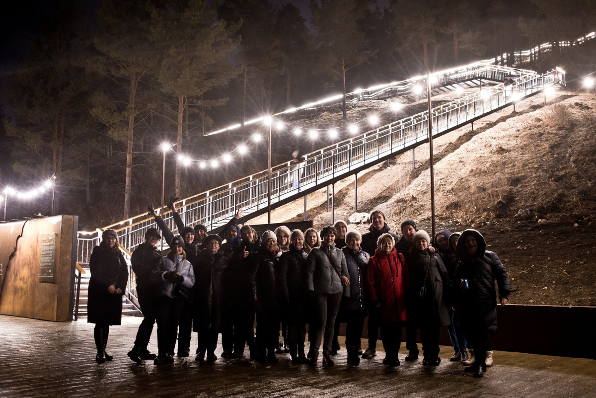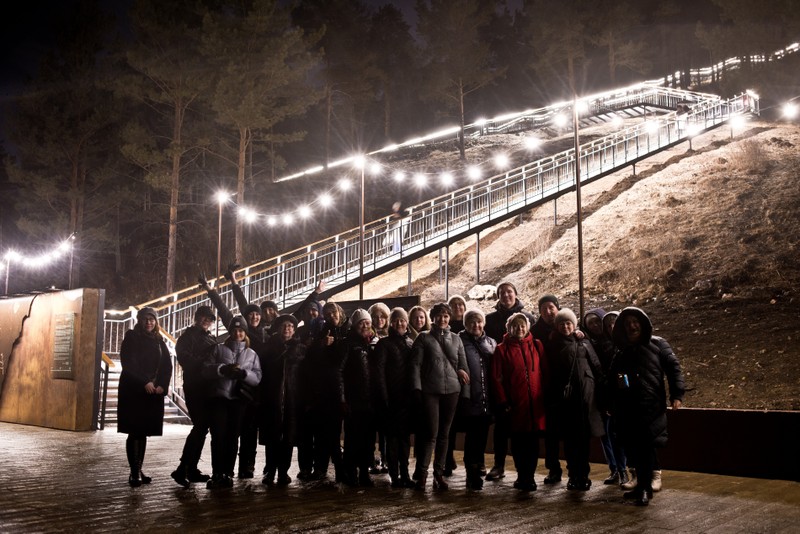 Торгашинская лестница — самая длинная в России. Подсвеченные 1683 ступеньки тянутся вверх яркой непрерывной линией, будто рассекая хребет горы.