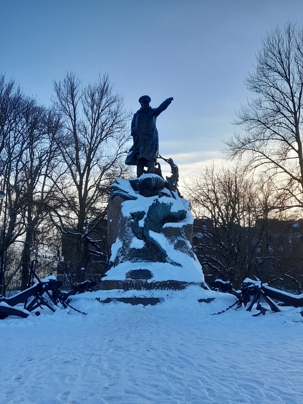 С пристани нам откроется вид на Среднюю, Купеческую и Заводскую гавани, где пришвартованы огромные военные корабли. Кажется, только вчера здесь встречали первый ледокол арктического класса и команду таллинского перехода, а линкор Марат сражался в неравных артиллерийских дуэлях. Специально для прохода с пристани на Якорную площадь рабочие пароходного завода возвели Макаровский мост. По голландским липовым аллеям мы дойдем до памятника вице-адмиралу, с которыми связаны самые яркие и трагические события революций и последнего мятежа.