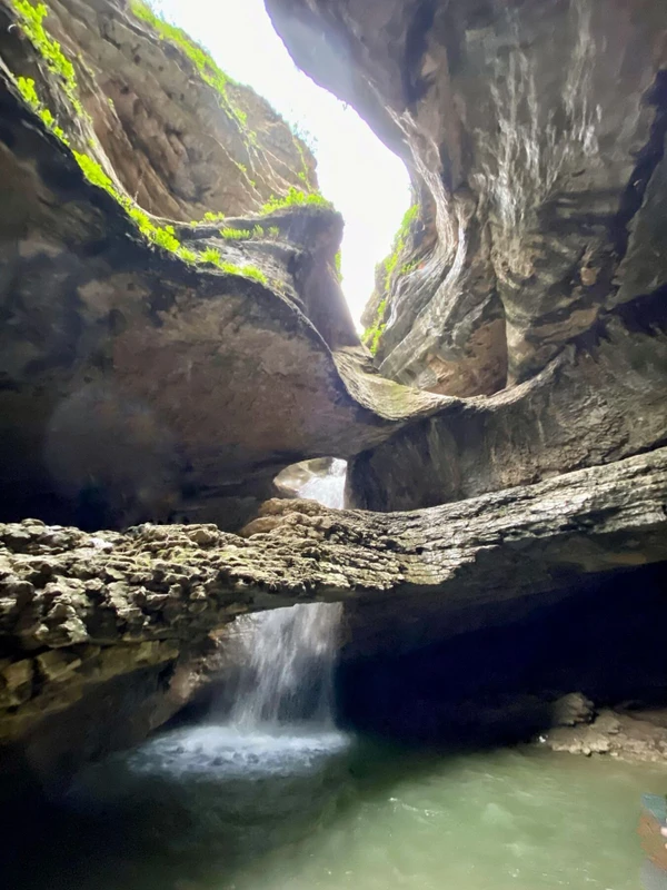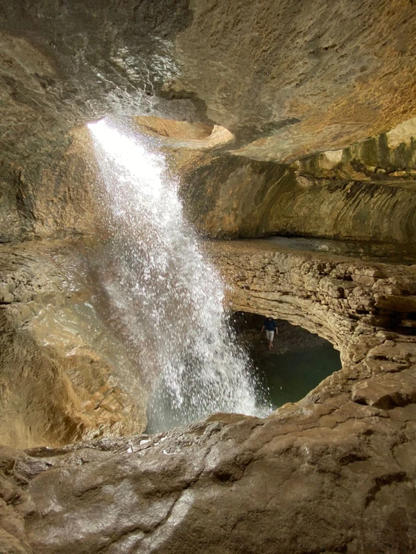 17:00 — Салтинский водопад в пещере. Вода и свет пробиваются через отверстие в своде — очень атмосферное место!