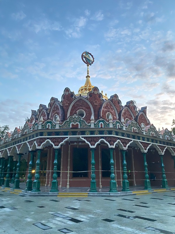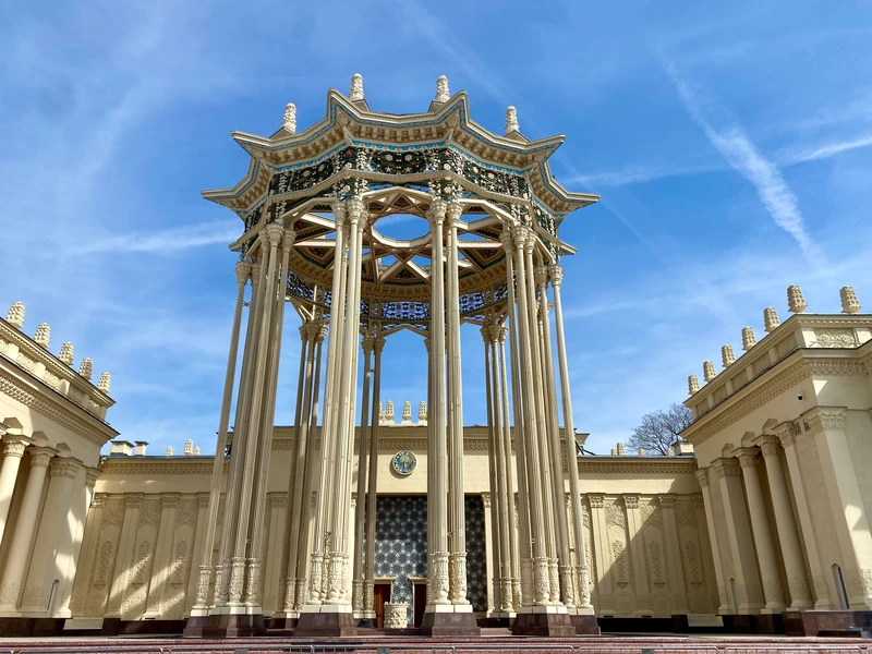 - Центральный павильон — белоснежный дворец советского ампира