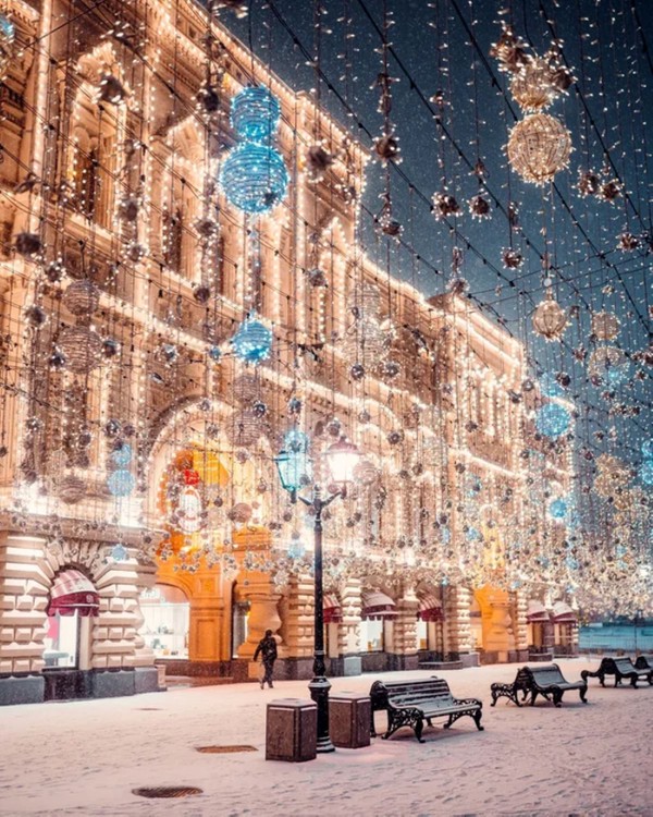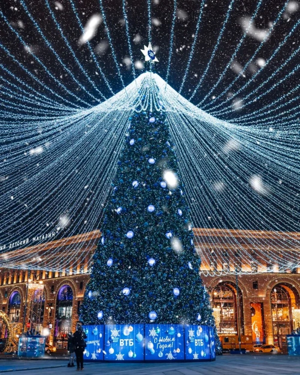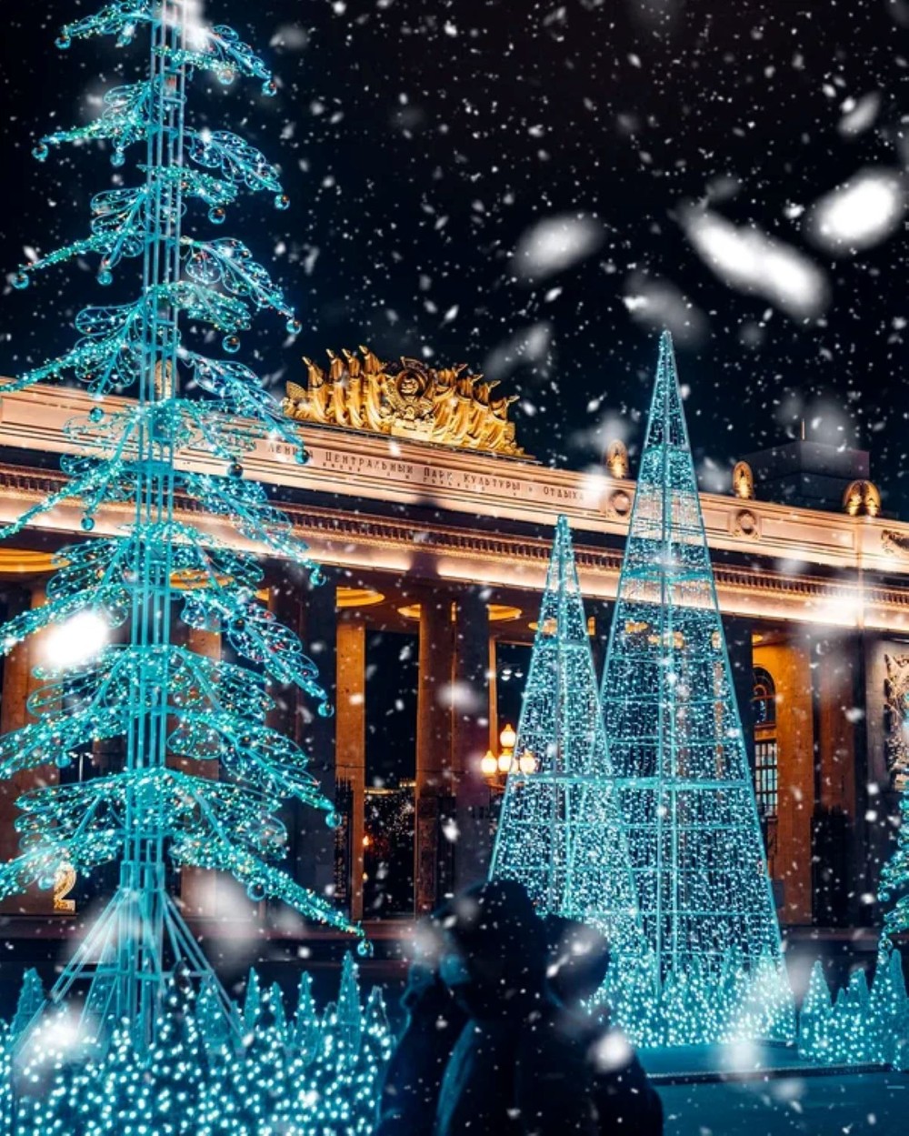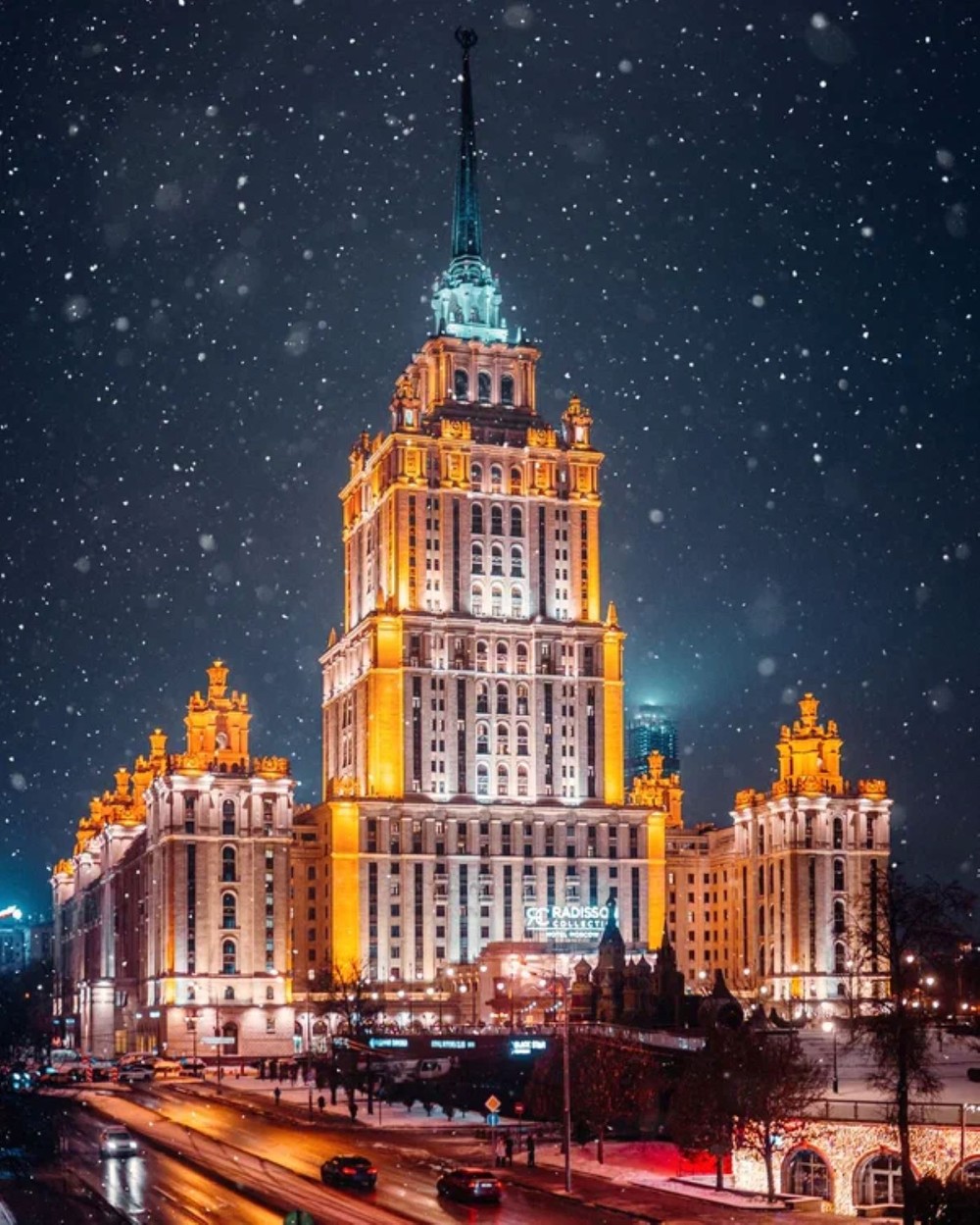 Первая остановка — гостиница «Украина» на Кутузовском проспекте. Прогулка по световой аллее под арками с тысячами огней, хоровод и танцы под новогодние мелодии.