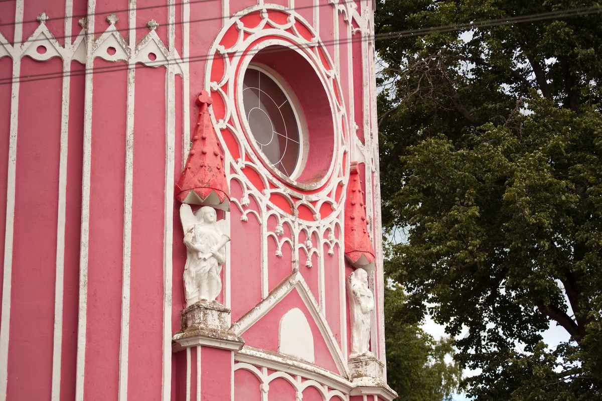 Недалеко от Старицы вы увидите редкий для тверского края псевдоготический храм Преображения Господня — словно розовое воздушное облако, сотканное из каменного кружева. Нежные линии, остроконечные шпили и готическая «роза» над входом делают его настоящим архитектурным чудом.