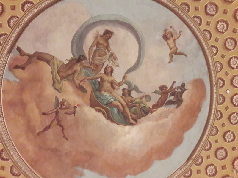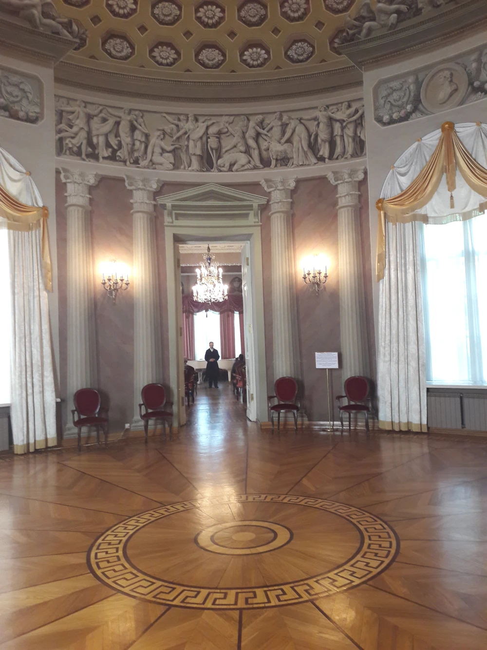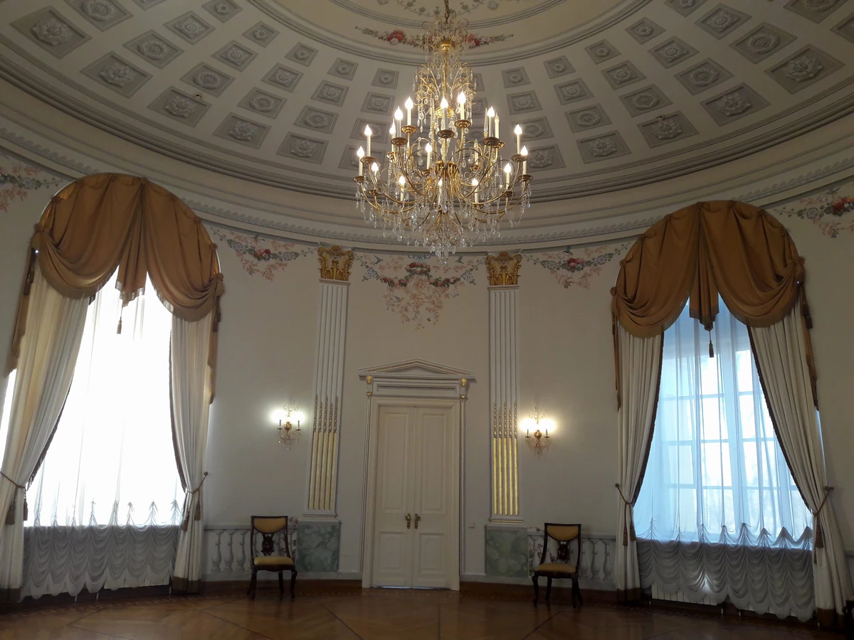 Вы полюбуетесь убранством парадных комнат и представите, какие балы здесь устраивал хозяин. Круглый зал с античными росписями, Мраморный зал для танцев, а также зал с колоннами — но больше всего гостей дворца удивляла театральная сцена с механическими машинами, которые воссоздают звуки дождя, грома и ветра.