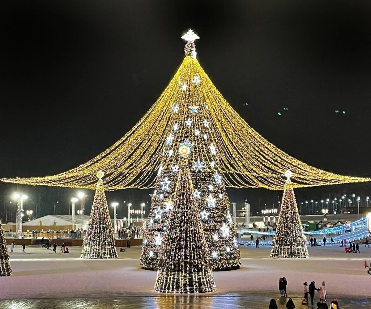 На площади возвышается 30-метровая красавица-ёлка, украшенная тысячами гирлянд и авторскими украшениями.