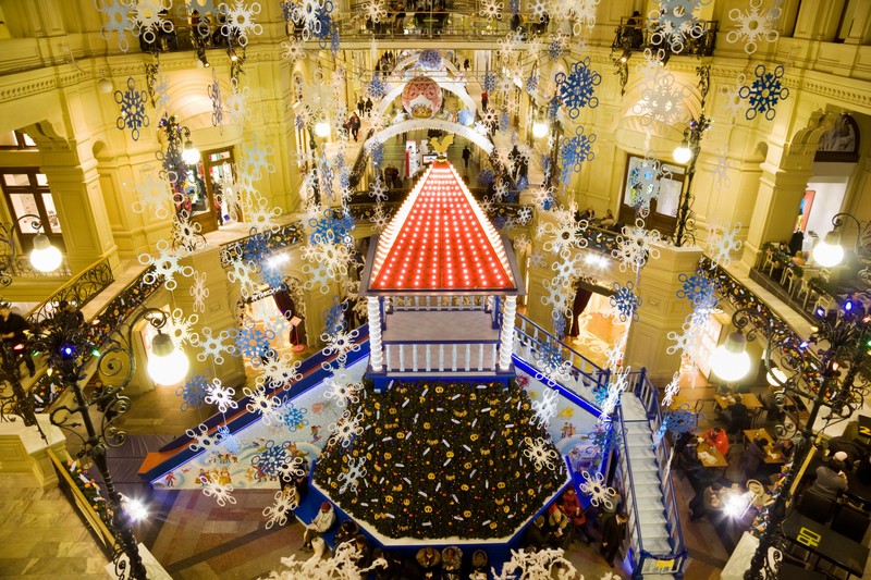 - Вы увидите самый атмосферный каток Москвы — ГУМ-каток на Красной площади. Вот где настоящая новогодняя атмосфера: сверкающие огни ГУМа, новогодние песни, рождественская ёлка, знаменитая ярмарка с милыми домиками-ларцами и каруселями.