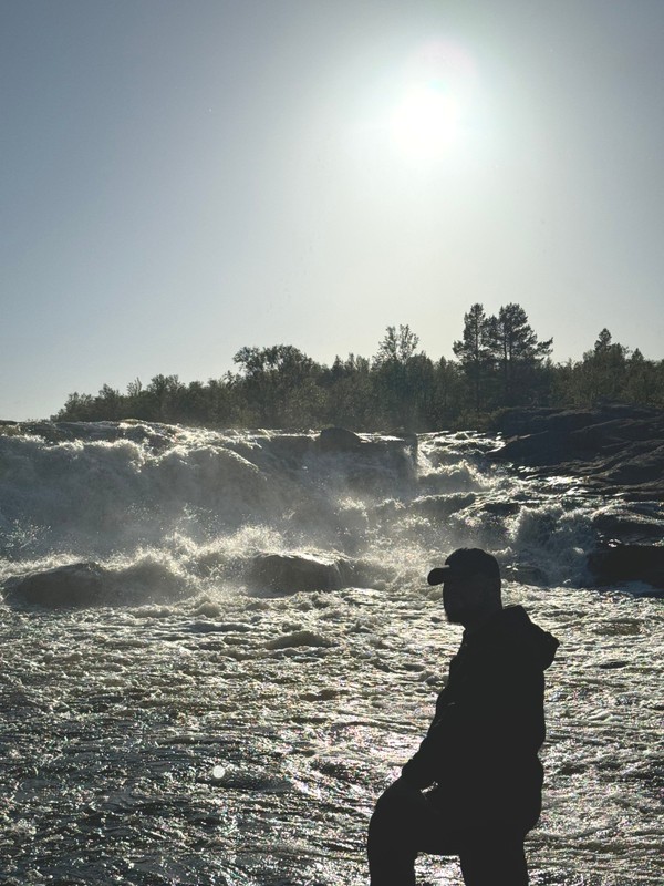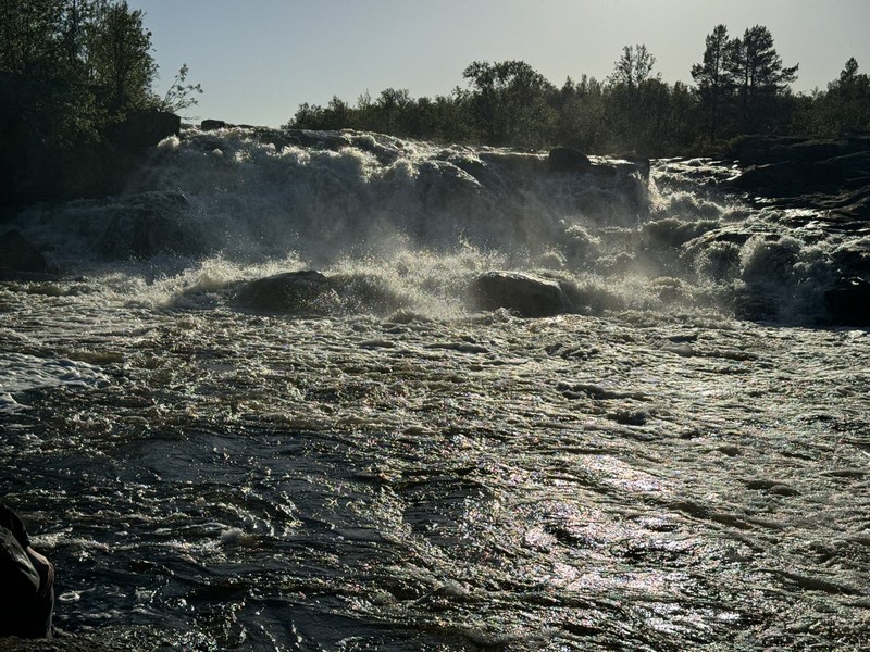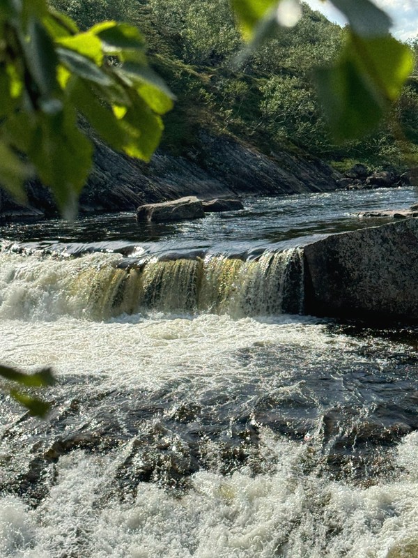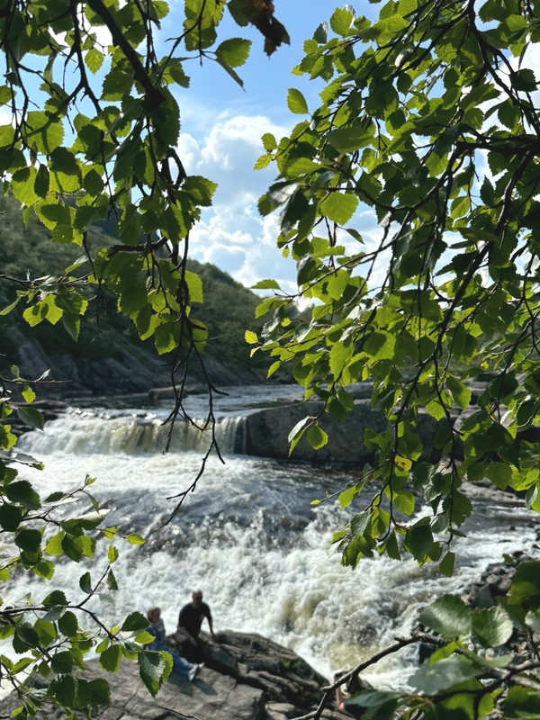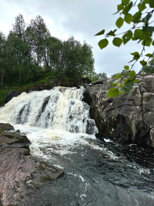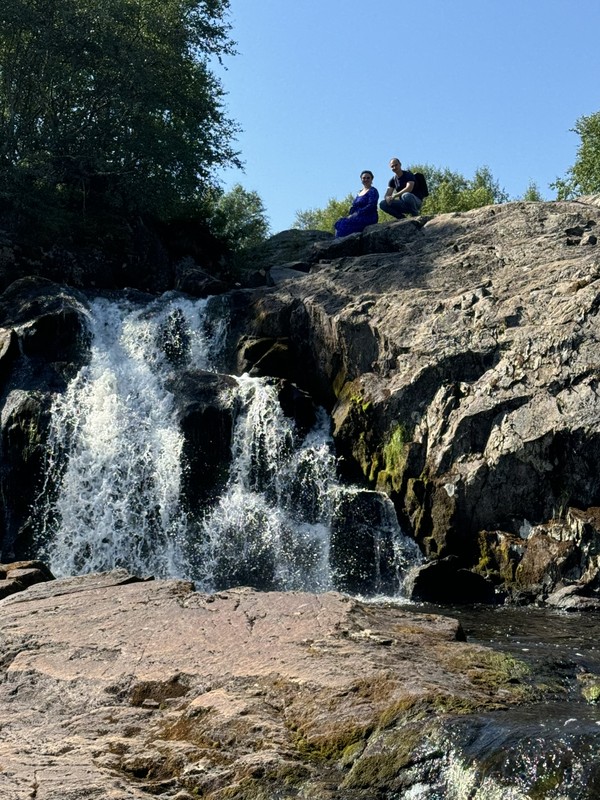 Первый водопад в нашей программе — небольшой, но мощный поток, пробивающийся сквозь камни. Вокруг — леса, мох, щебнистые берега. Здесь легко почувствовать, как природа щедро дарит тишину и покой.