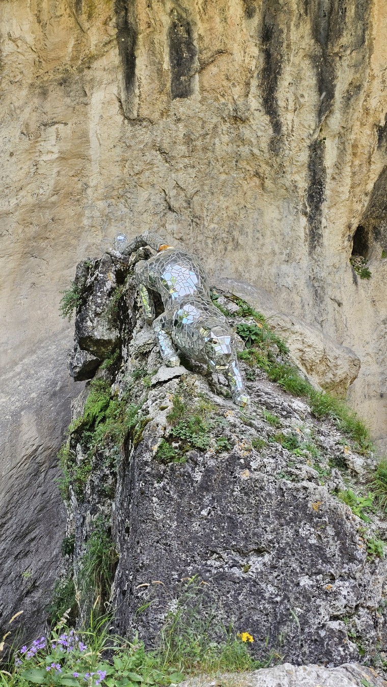 Арт-объект «Зеркальный Барс», притаившийся между величественными скалами.