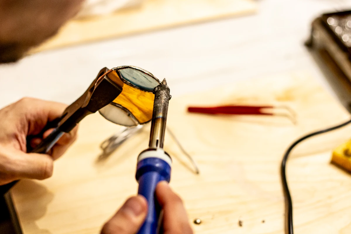 " В нашей уютной мастерской мы обучим вас базовым навыкам витражного дела. Расскажем, какие бывают техники и что для них требуется. Подскажем, как лучше реализовать вашу задумку. А в финале у вас получится небольшой витраж, который сразу можно унести домой. "