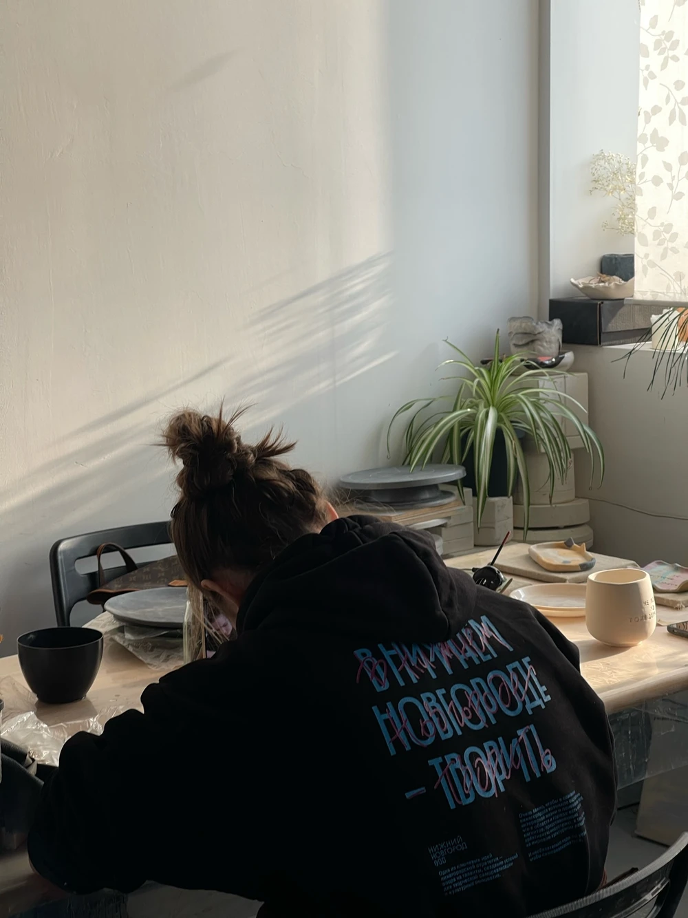 - Занятие проходит в мастерской в центре города: из окон открывается красивый вид, а совсем рядом атмосферные улочки, где мы сами часто гуляем и вдохновляемся эстетикой Нижнего