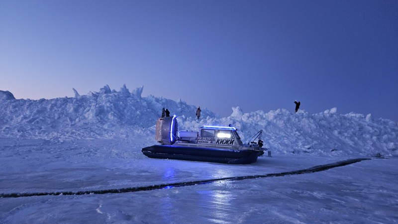 На закате мы устроим для вас поездку на катере на воздушной подушке по замёрзшему Онежскому озеру. На судне установлено мощное освещение, которое позволит видеть всё вокруг. По пути к острову капитан развлечёт вас рассказами про острова, озеро и лёд.