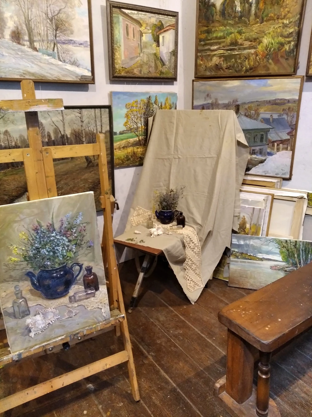 Вы вдохновитесь картинами, что представлены в творческом пространстве, возьмёте кисть и напишете пейзаж маслом — в самой студии или, если погода позволит, на берегу Волги неподалёку от неё. Я помогу, а ещё расскажу:
