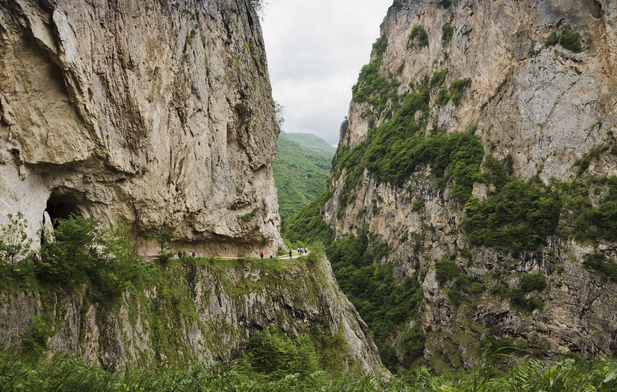 15:00 — Черекская теснина. По серпантину доедем до этого сурового ущелья, 1000-метровые скалы которого буквально нависают над дорогой. 20-30 мин. на прогулку и фото.