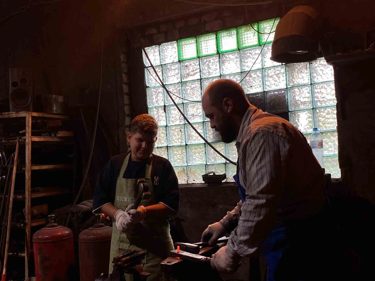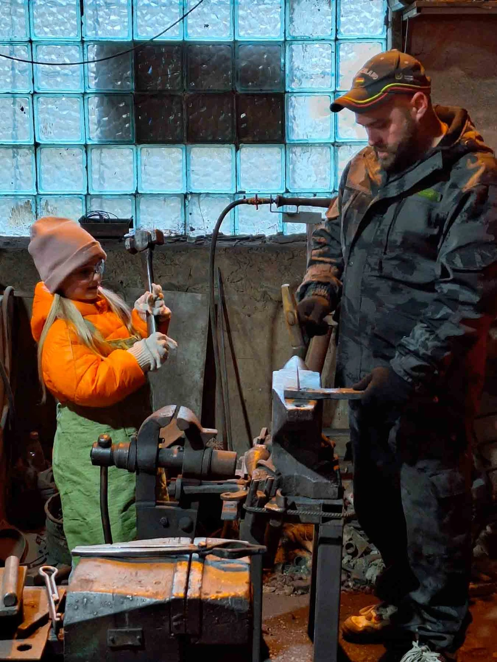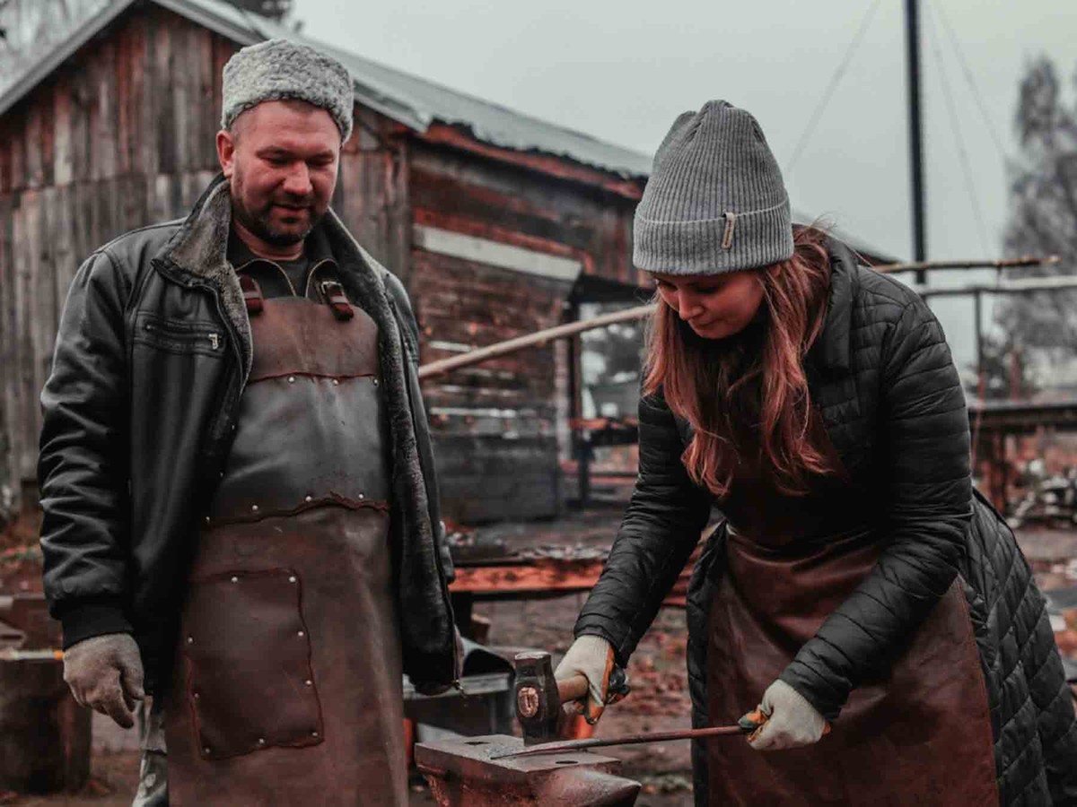 Я встречу вас у кузницы и расскажу, как здесь всё устроено. Провожу к мастеру — он познакомит с инструментами, поделится профессиональными секретами и поможет вам: